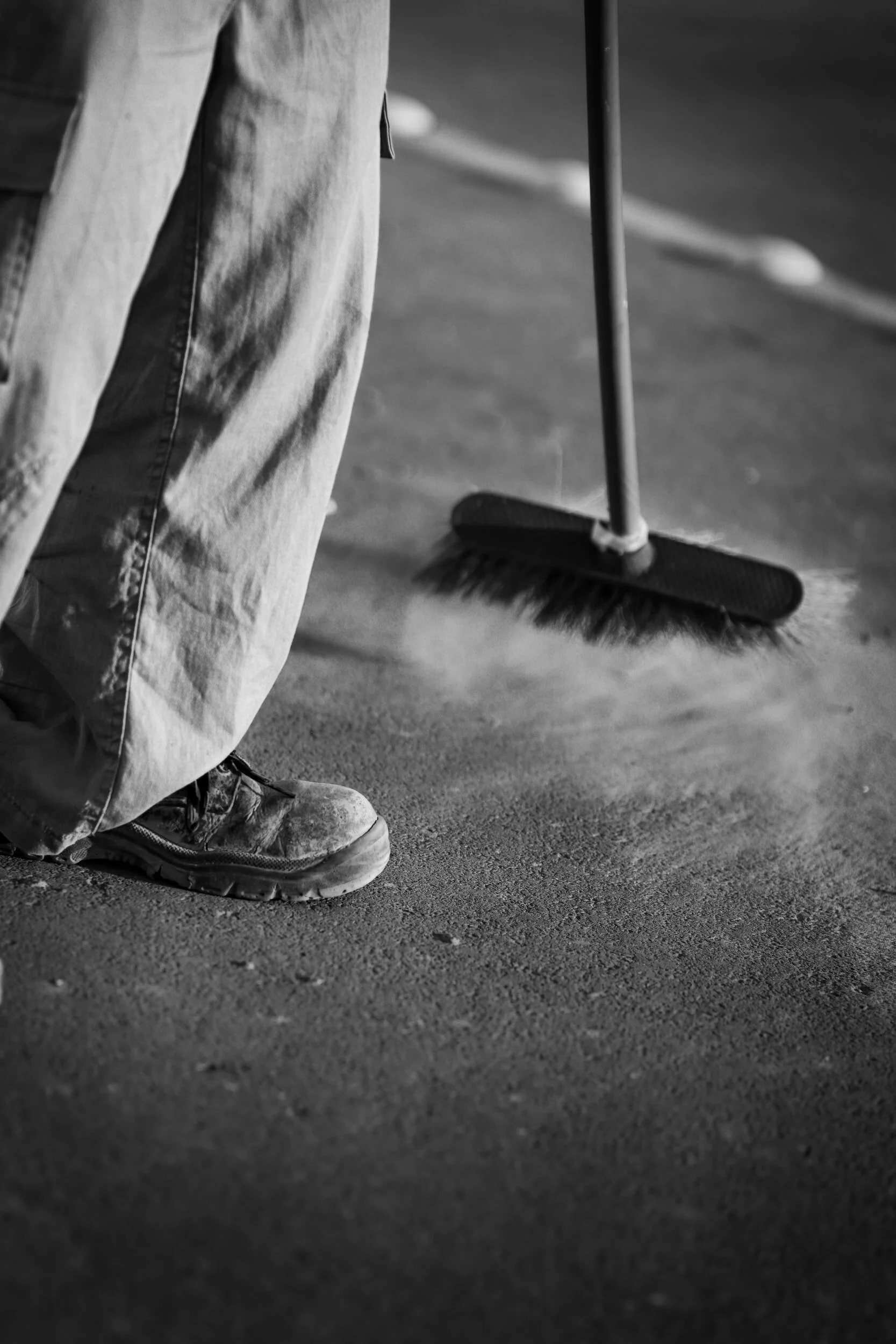 The minimum would be to have numerous people with push brooms going from one end to the other. This will result in airborne dust and disgruntled employees, because brooms do not have vacuums attached. Choose rather to use a ride-on mechanical sweeper, which is vacuum assisted. It will leave the floor clean and the air pure. All debris can then be emptied to a rubbish bin.